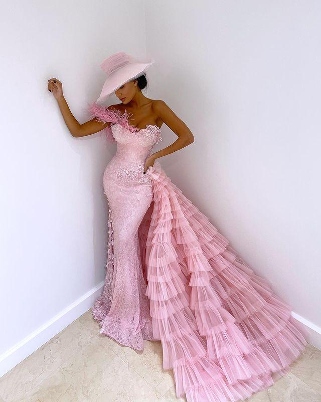 Pink Mermaid Prom Dresses One Shoulder Feather Lace Appliqued Evening Dress,PD49003