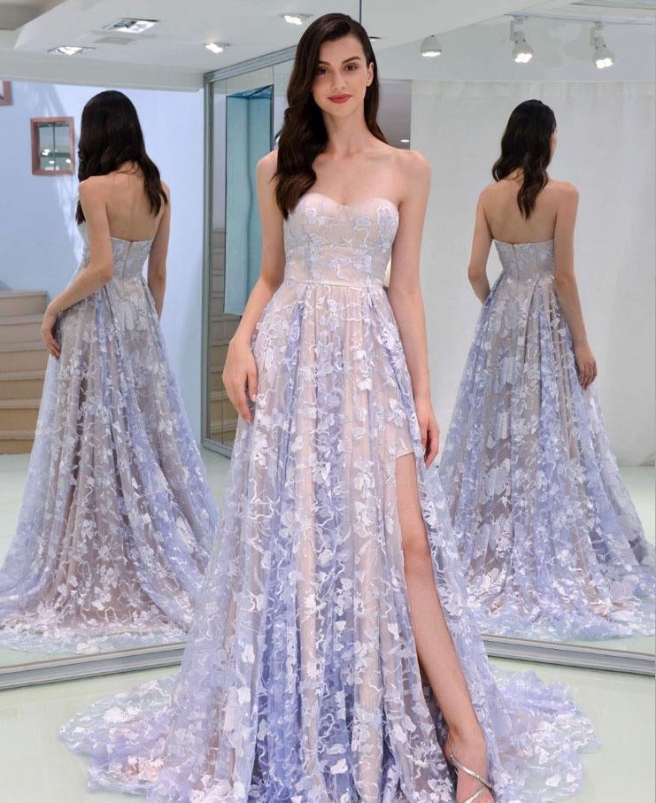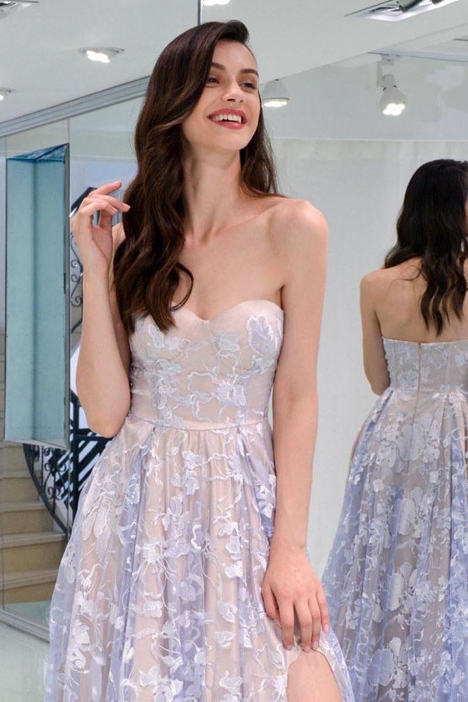 Charming Sweetheart Strapless Lace Appliques Lilac Prom Dresses,PD49041