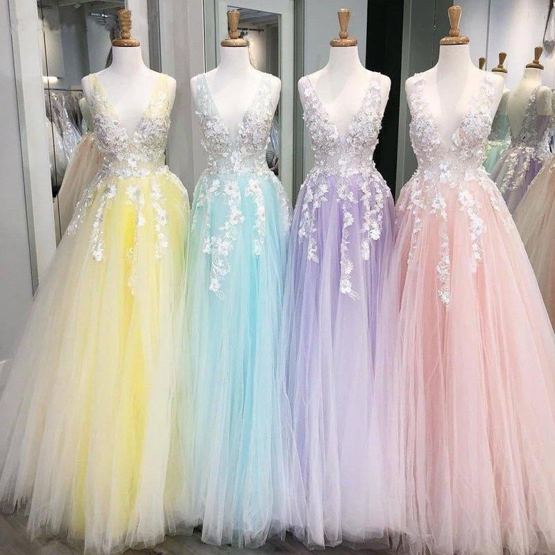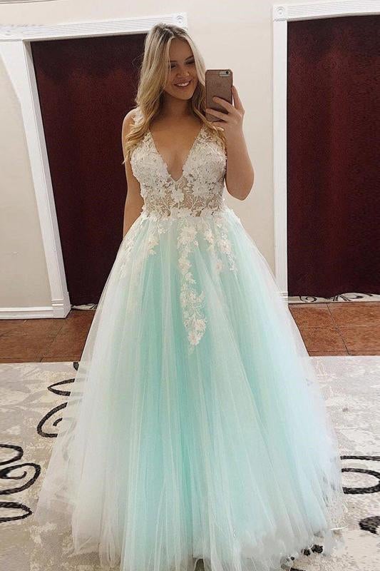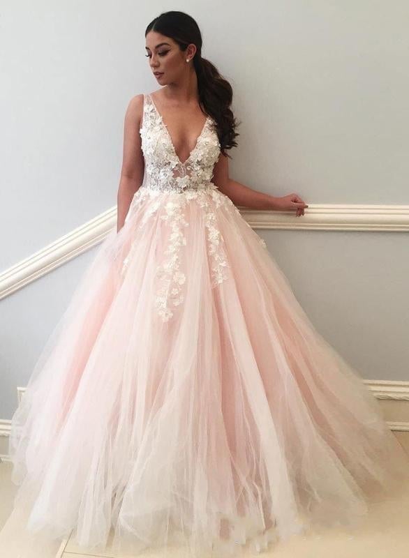 Charming Ball Gown V Neck Tulle Lace Appliques Prom Dresses Evening,PD49044