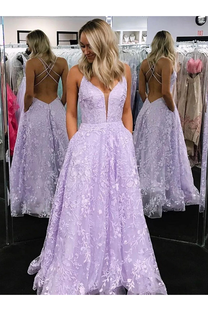 A-Line Floor Length Lace Prom Dresses Backless Formal Gown,PD49095