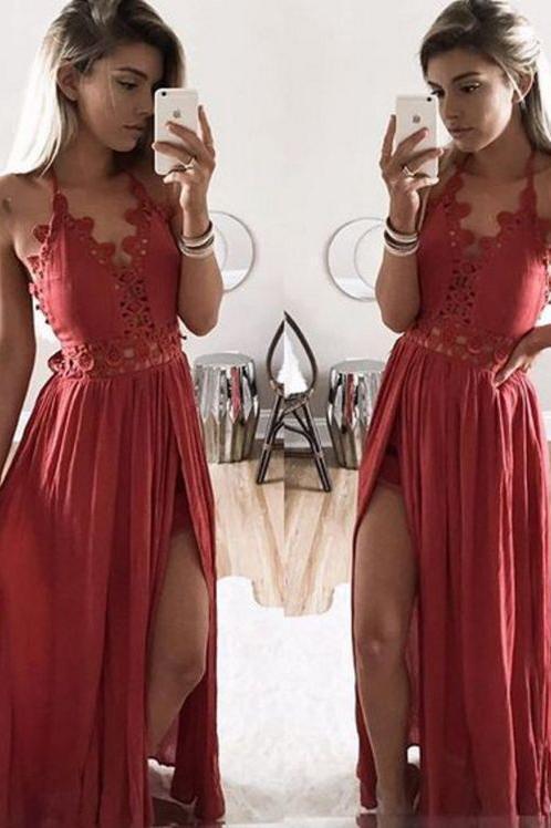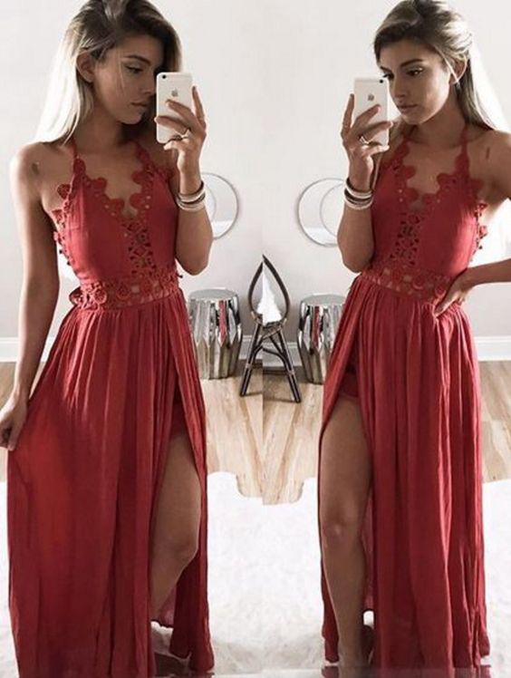 A Line Halter Lace Appliques V Neck Prom Dresses with Slit, Evening dress,PD49118