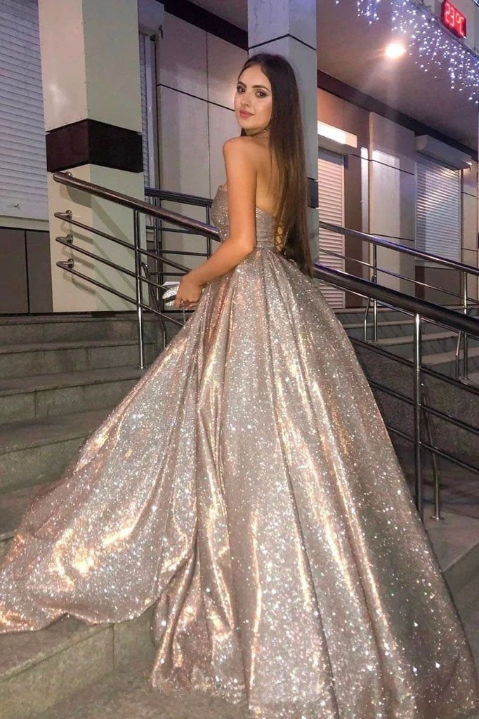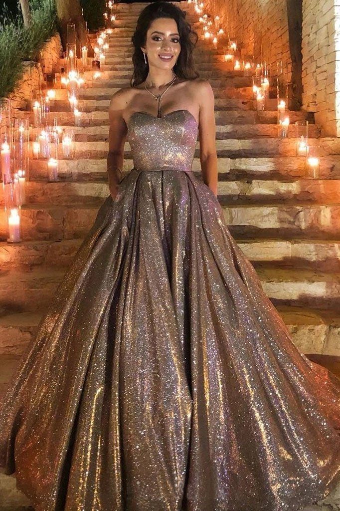 Sparkly Ball Gown Sweetheart Strapless Prom Dresses with Pockets,PD49124