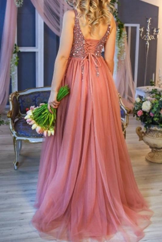 Princess A line V Neck Tulle Beads Sequins Prom Dresses with Lace up ,PD49127
