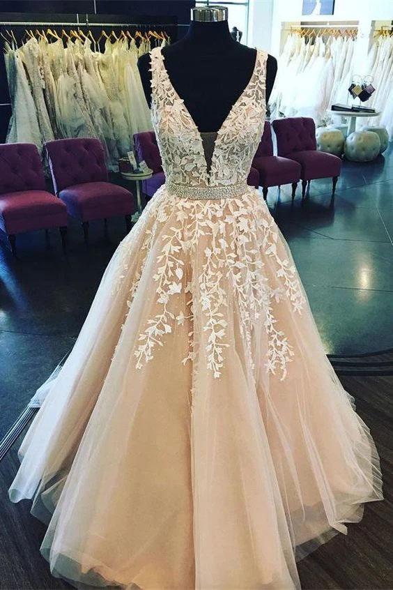 Fashion Ball Gown V Neck Prom Dresses with Appliques and Beads, Quinceanera Dresses,PD49141