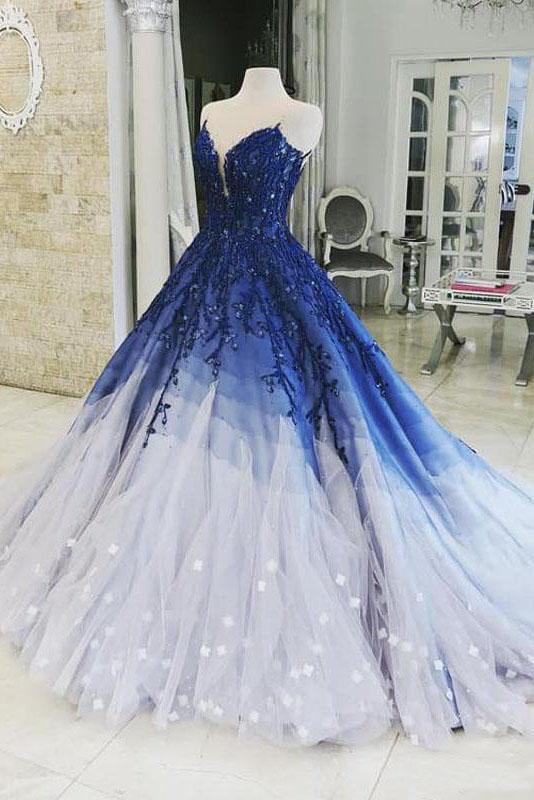 Ombre Ball Gown Royal Blue Prom Dresses With Appliques, Long V Neck Quinceanera Dresses,PD49200
