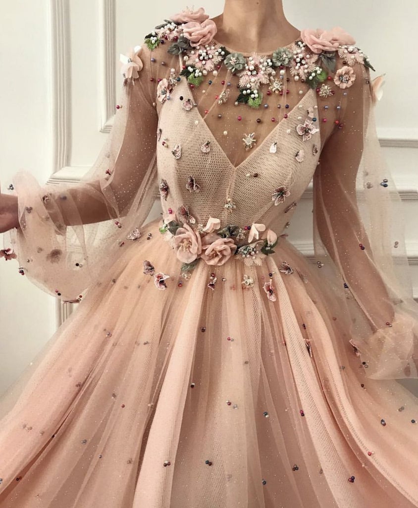 Charming A Line Long Sleeve Long Party Dresses Flowers Tulle Beads Formal Dresses ,PD49251