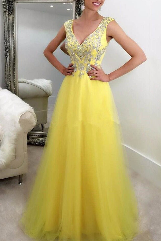 Yellow tulle sequins beading v-neck graduation dress prom,PD49233