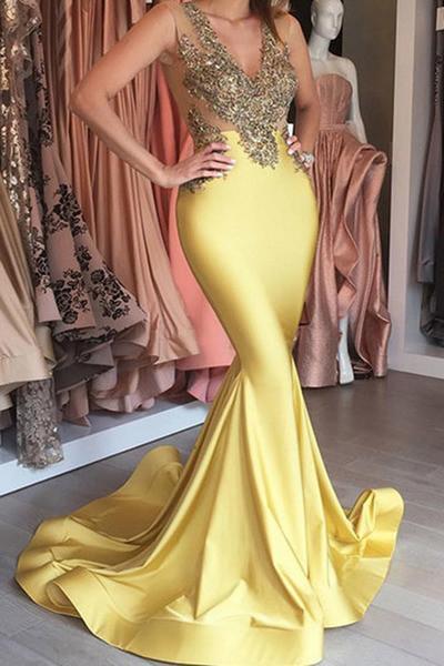 Yellow satins gold lace applique V-neck see-through slim-line long dress mermaid Evening Dresses,PD49303