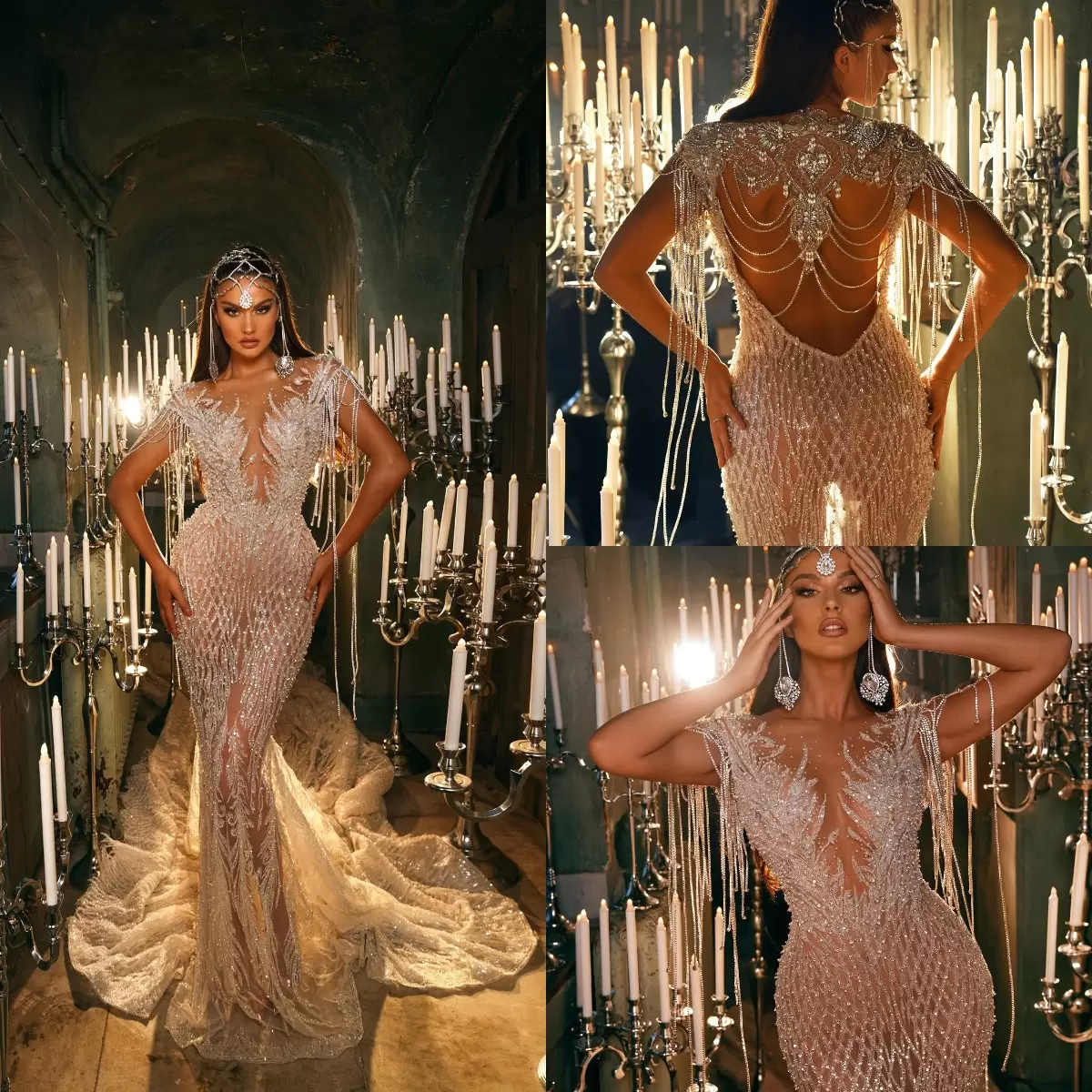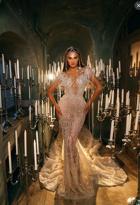 Mermaid Prom Dresses Lace Appliqued Sheer Jewel Neck Crystal Evening Dress With Long Train Formal Gowns,PD49004