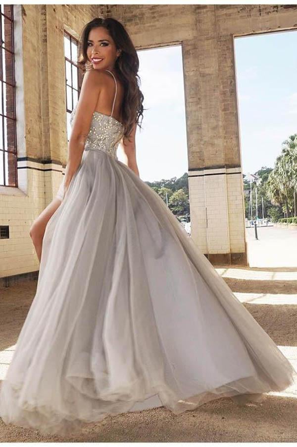A-Line Bead Silver Spaghetti Straps Sweetheart Slit Tulle Backless Sleeveless Evening,PD49011