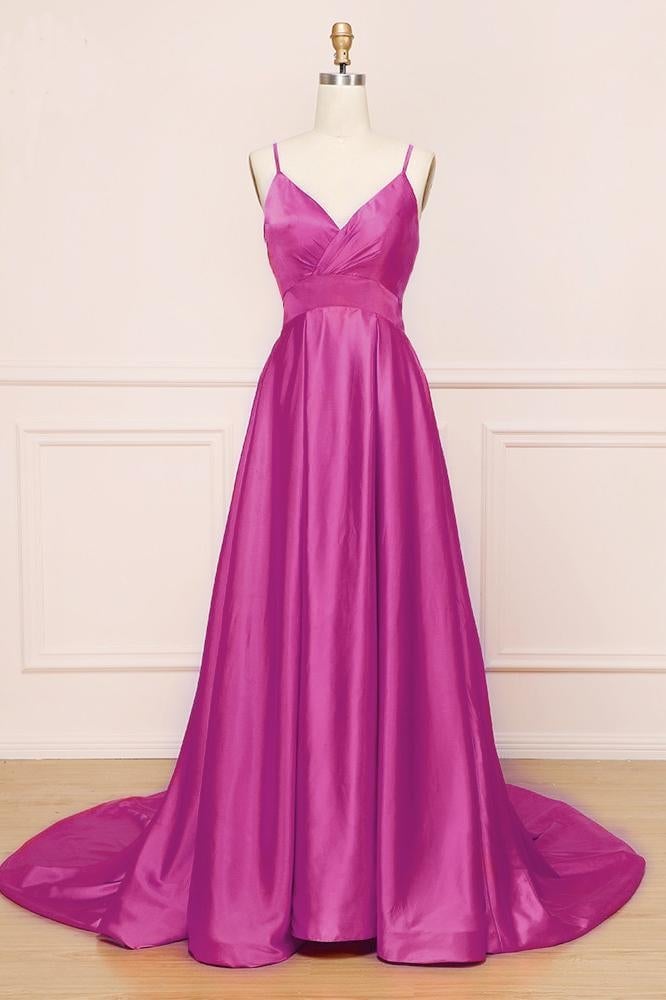 Simple A Line Spaghetti Straps V Neck Satin Backless Prom Dresses Party,PD49017