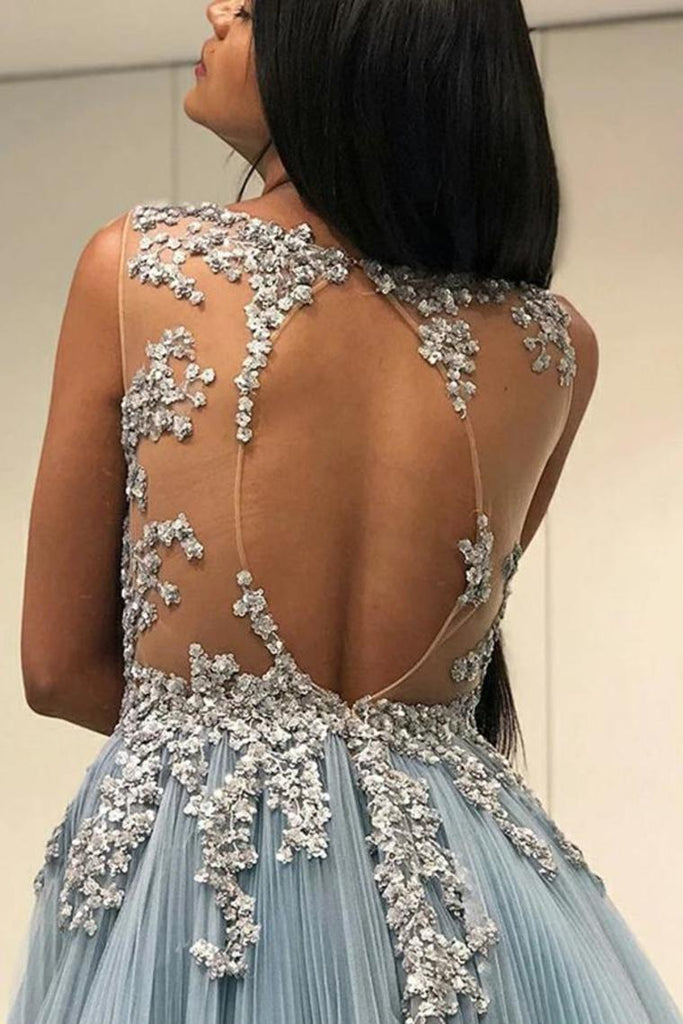 A Line Sleeveless See Through Tulle Prom Dress With Appliques Floor Length Formal,PD49074