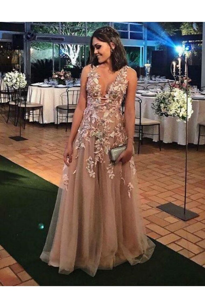 A-Line V Neck Appliques Floor Length Prom Dresses Tulle Evening,PD49098