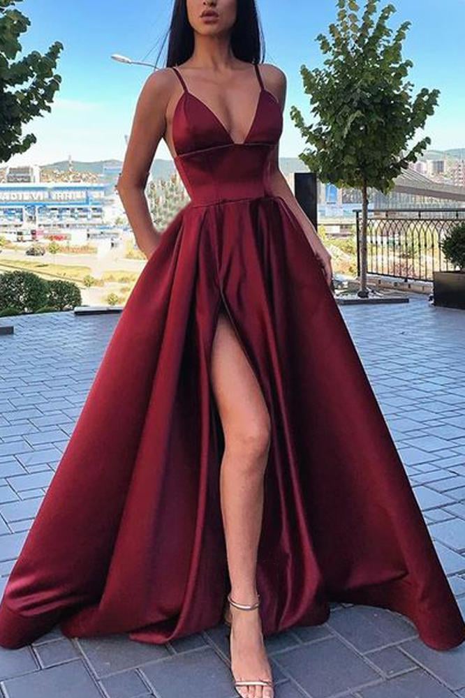 Simple A Line Spaghetti Straps V Neck Satin Prom Dresses with Slit,PD49112