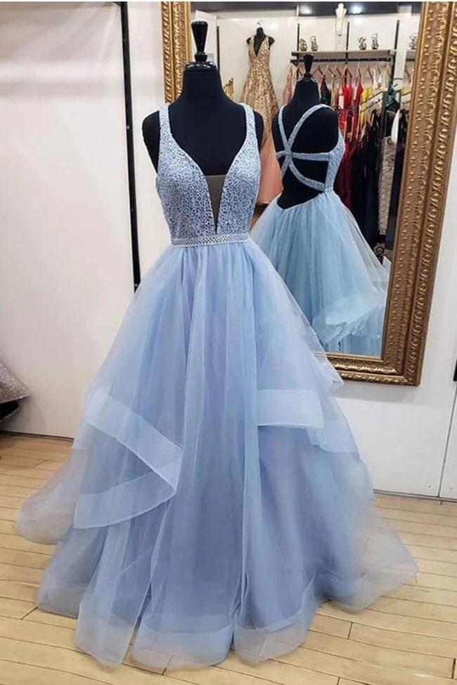 Elegant Ball Gown Lavender V Neck Prom Dresses Tulle Criss Cross Straps Dance Dresses,PD49229