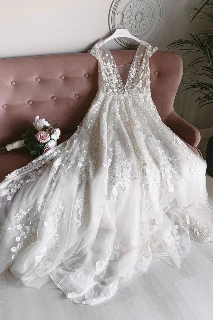 Elegant A-line V-neck Long Prom Dresses Appliques Backless Wedding Dresses,PD49231