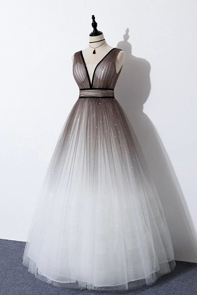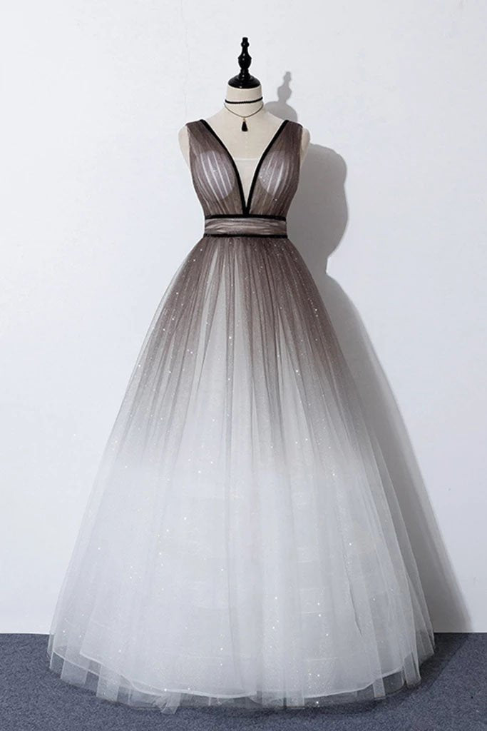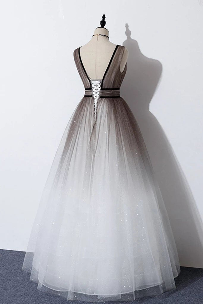 Elegant A Line Long Tulle V Neck Straps Prom Dresses, Lace up Party Dresses,PD49232