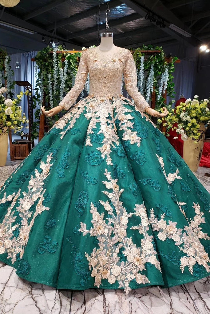 Ball Gown Long Sleeve Satin Beads Prom Dresses, Quinceanera Dresses with Appliques ,PD49260