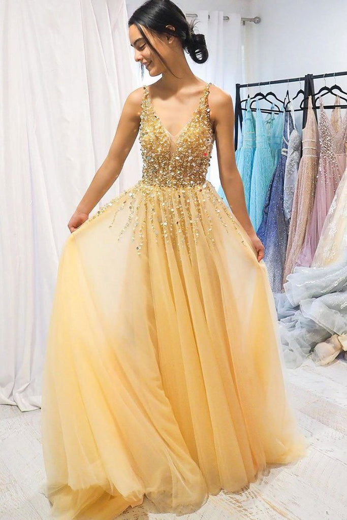 A Line Gold V Neck Beading Tulle Prom Dresses Spaghetti Straps Long Cheap Formal Dress,PD49287