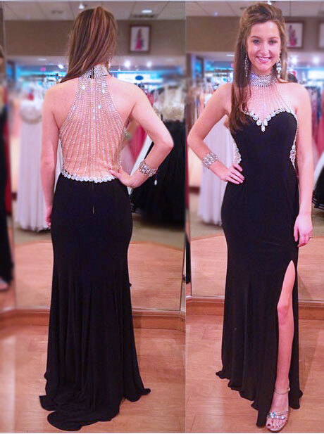 Gorgeous Prom Dresses,High-Neck Prom Dresses,Beaded Prom Dresses,Slit Prom Dresses ,Black Floor Length Prom Dresses,Sexy Prom Dresses,PD390090