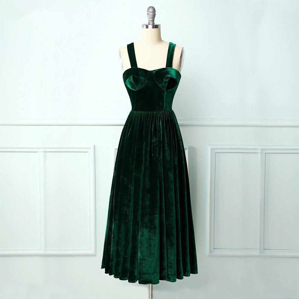Vintage A-Line Sweetheart Straps Open Back Dark Green Velvet Floor Length Prom Dresses,PD49160
