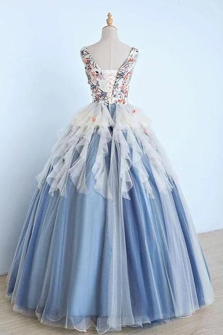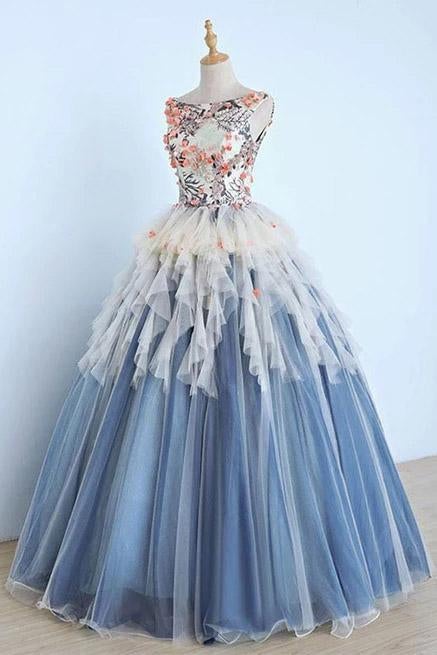 Princess Ball Gown Appliques Blue Tulle Prom Dresses, Sweet 16 Dress, Quinceanera Dress,PD49201