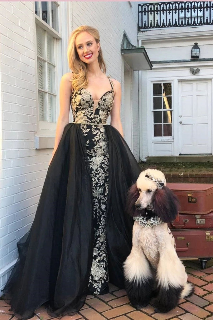 Mermaid V Neck Gold and Black Long Prom Dresses With Appliques, Formal Gowns,PD49203