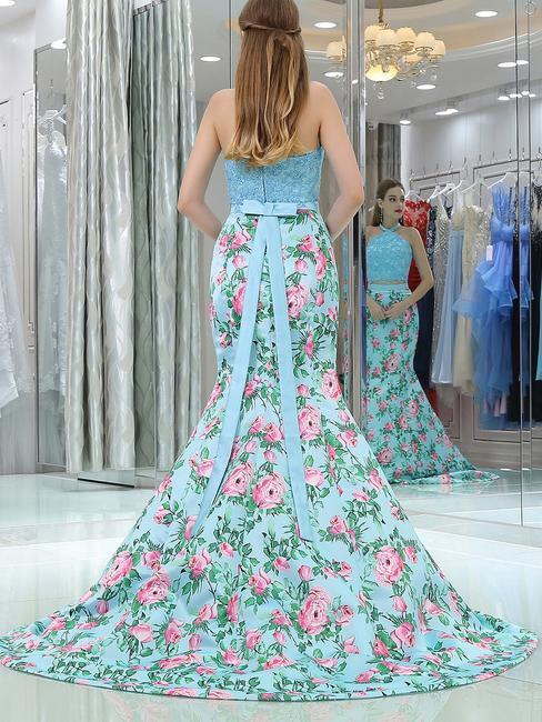 Elegant Mermaid Halter Two Pieces Blue Floral Prom Dresses, Beads Evening Dresses,PD49222