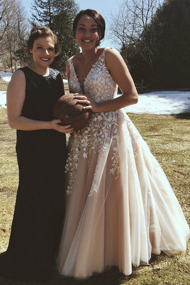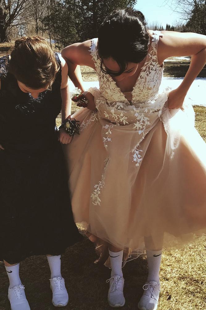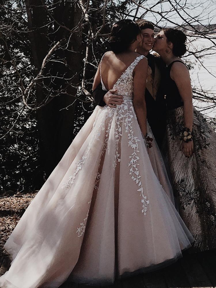 A-Line V Neck Open Back Tulle Long Prom Dresses with Applique, Backless Evening Dresses ,PD49265