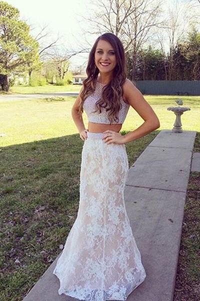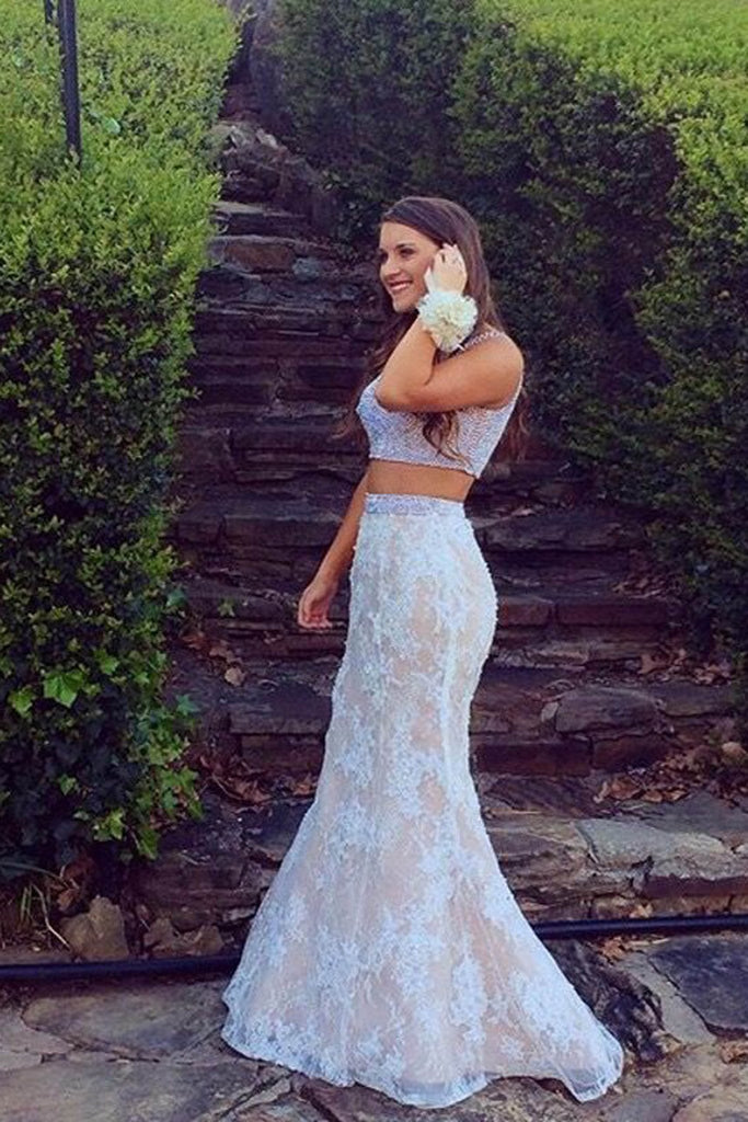 White lace two pieces mermaid beading long prom dress graduation,PD49245