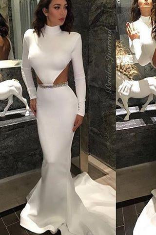 White High Neck Mermaid Long Sleeve Hollow Waist Backless Saudi Arabia Prom Dresses,PD49310