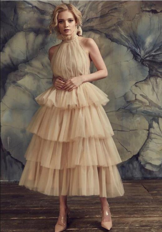 Tulle High-Neck Champagne Prom Gown with Tiered dress,PD49340