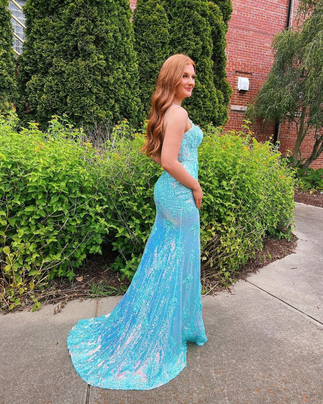 Charming Sparkly Mermaid Sequins Long Prom Dresses with Slit,Spaghetti Straps Applique Evening Dresses,PD49391